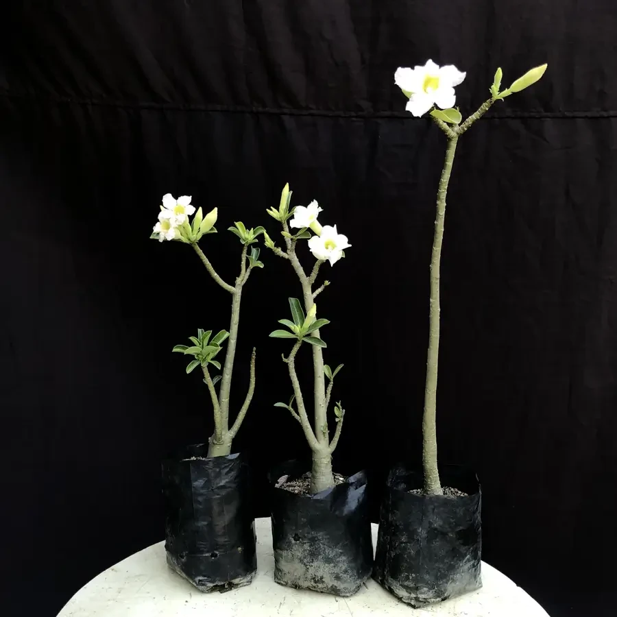 Adenium white flower, seed grown plant. Plant age is around 1 year. Flower color is confirmed by blooming.